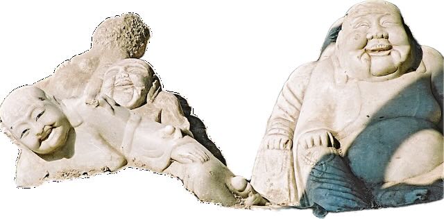 Lachende Buddhas in einer Straßenwerkstätte in Myanmar, 2002