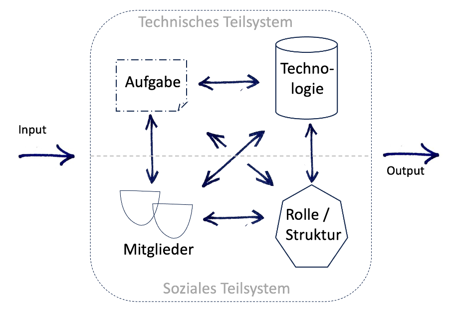 Es enthält zwei Teilsysteme, das soziale und das technische Teilsystem. Das technische beruht auf Interaktionen zwischen zwei Komponenten: der Aufgabe und der Technologie. Das soziale beruht auf Interaktionen zwischen Menschen in der jeweiligen vorstrukturierten Rolle. Wie die Pfeile symbolisieren, sind alle Teilkomponenten voneinander abhängig bzw. aufeinander bezogen.