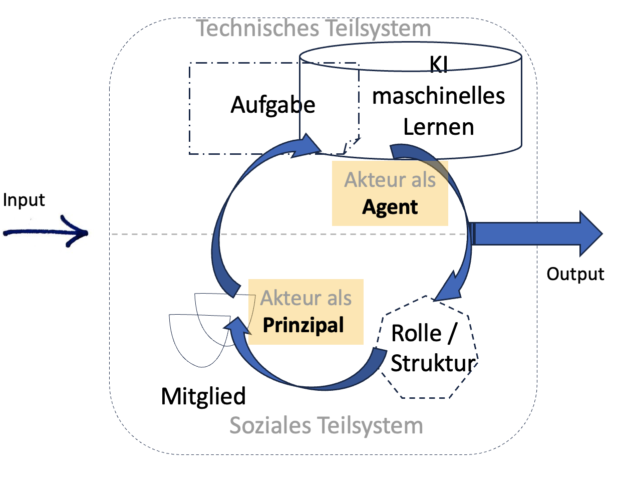 Mit anderen Worten, die Brauchbarkeit des soziotechnischen Systemmodells wird durch die KI-Revolution gesenkt, wenn nicht gar zunichte gemacht. Beachtet man die Algorithmen und die Trainingsbasis der Sprachmodelle, sind nun Aufgabe und KI/maschinelles Lernen aufs Engste verknüpft und rekursiv in einem Schleifen-Modus eingespannt.