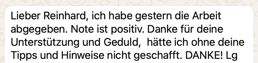 ich hatte heute meine Defensio und es ist alles super gelaufen. Masterarbeit "sehr gut" und ebenso die mündliche Prüfung. Ich danke dir vielmals für deine so wertvollen Inputs, für dein stets fachlich fundiertes Feedback und für deine immer verlässlichen und sehr prompten Rückmeldungen auf meine Fragen. Ich empfehle dich sehr gerne weiter. Vielen herzlichen Dank für deine Unterstützung!